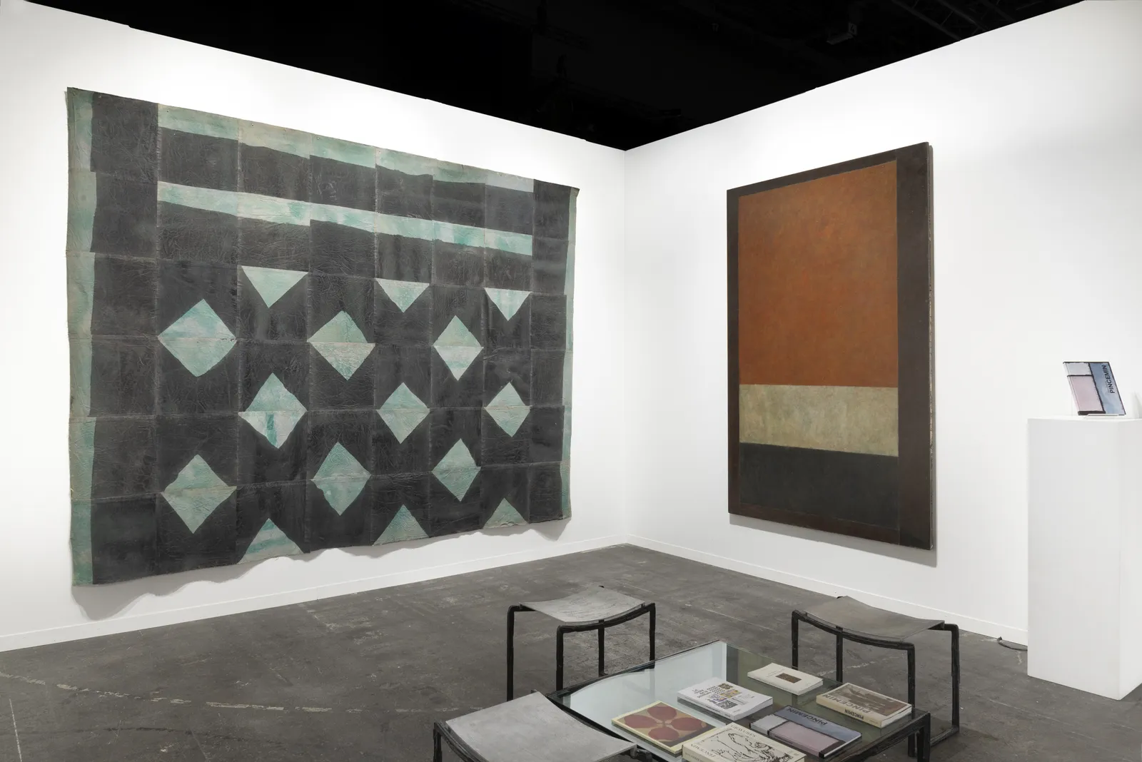 Taking this recommendation very seriously, his first works, **Carrés-Collés**, emerge—initially exploring themes similar to those of Supports/Surfaces—and later, **Palissades**. These are created based on predefined schemes: the canvas is cut into strips, dipped in paint baths, and then assembled into orthogonal compositions.